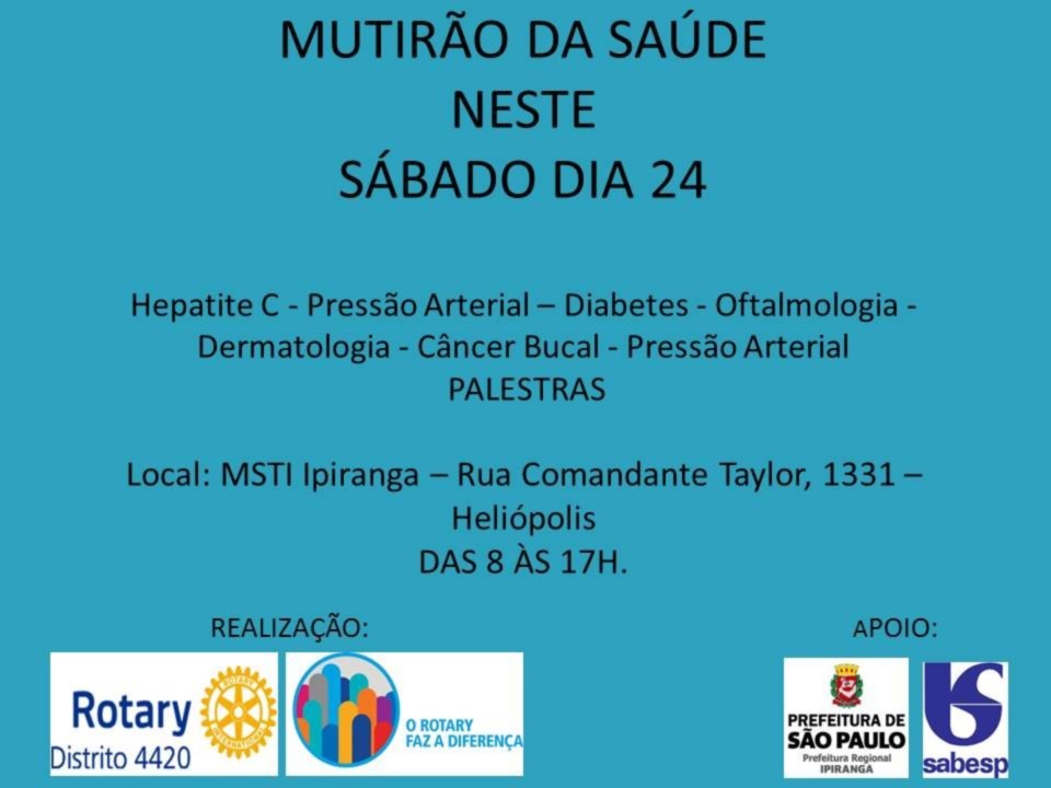 O Mutirão da Saúde foi realizado no dia 24/02/2018 das 8 às 17h, conjuntamente pelos clubes da Área 3: Rotary Club de São Paulo Anchieta, Rotary Club de São Paulo Ipiranga, Rotary Club de São Paulo Vila Mariana e Rotary de São Pulo Independência.